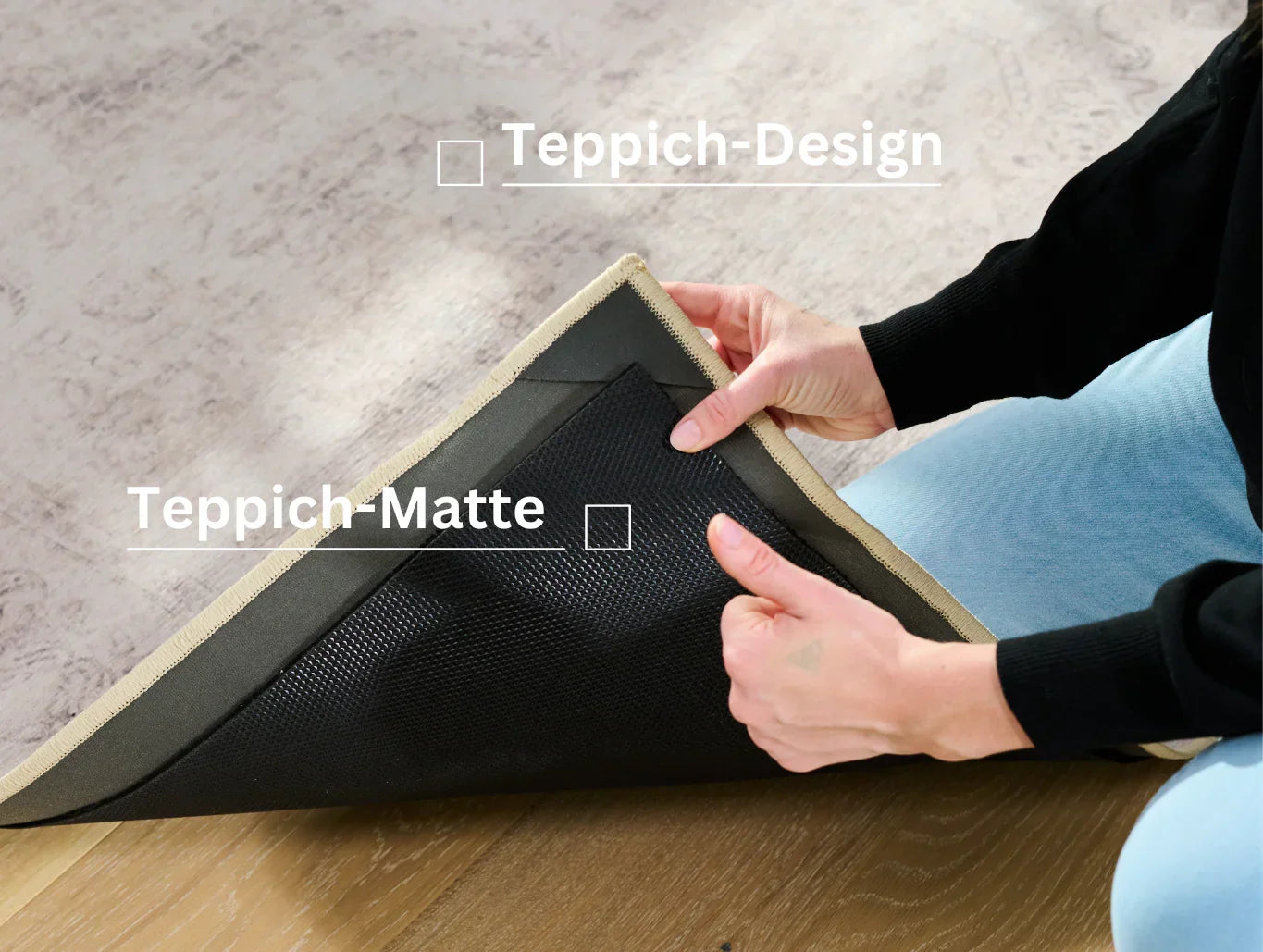 Als erstes rollst Du den unteren Teil, die rutschfeste Matte, auf Deinem sauberen Fußboden aus. Bitte achte darauf, dass die Matte glatt auf dem Boden liegt, damit die Rutschfestigkeit gewährleistet wird. Richte das zusammengerollte Design circa 2 cm über die Ecken der Matte aus und drücke beide Teile des Teppichs fest zusammen. Rolle danach Dein schönes Design auf der Matte aus und ziehe alles glatt – Et voilà – Zeit zum Wohlfühlen!